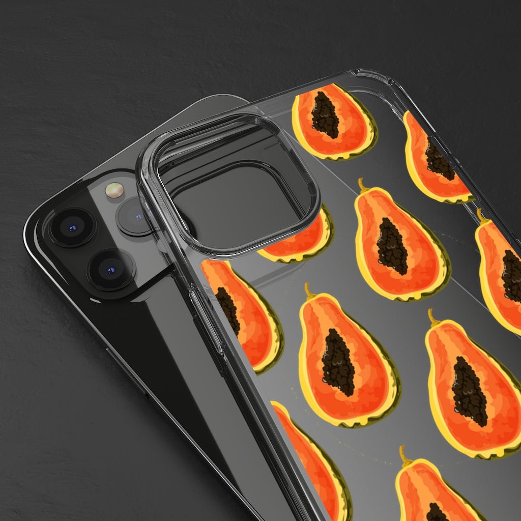 What kind of fruit is this? It's not an apple — but rather it's something completely different. A clear phone case with a strange orange tropical fruit.